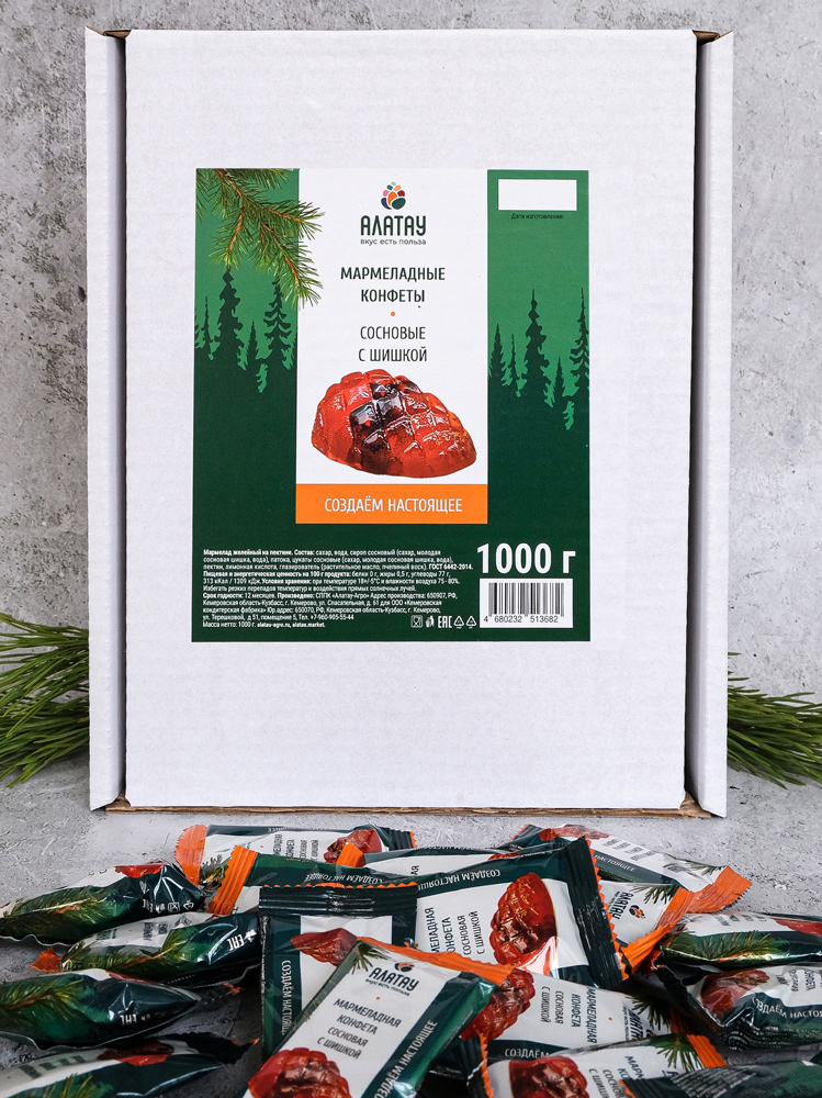<comment>Заказал 2 килограмовые пачки, второй вкус &quot;Байкал&quot;, тоже очень вкусный. Каждая мармеладинка упакована в индивидуальный пакетик. Этот вариант понравился больше, очень необычно, кажется, будто шишка застыла в смоле! Сам мармелад ровный, без изъянов и пузырей. К травяному чаю идеально подходит! </comment>